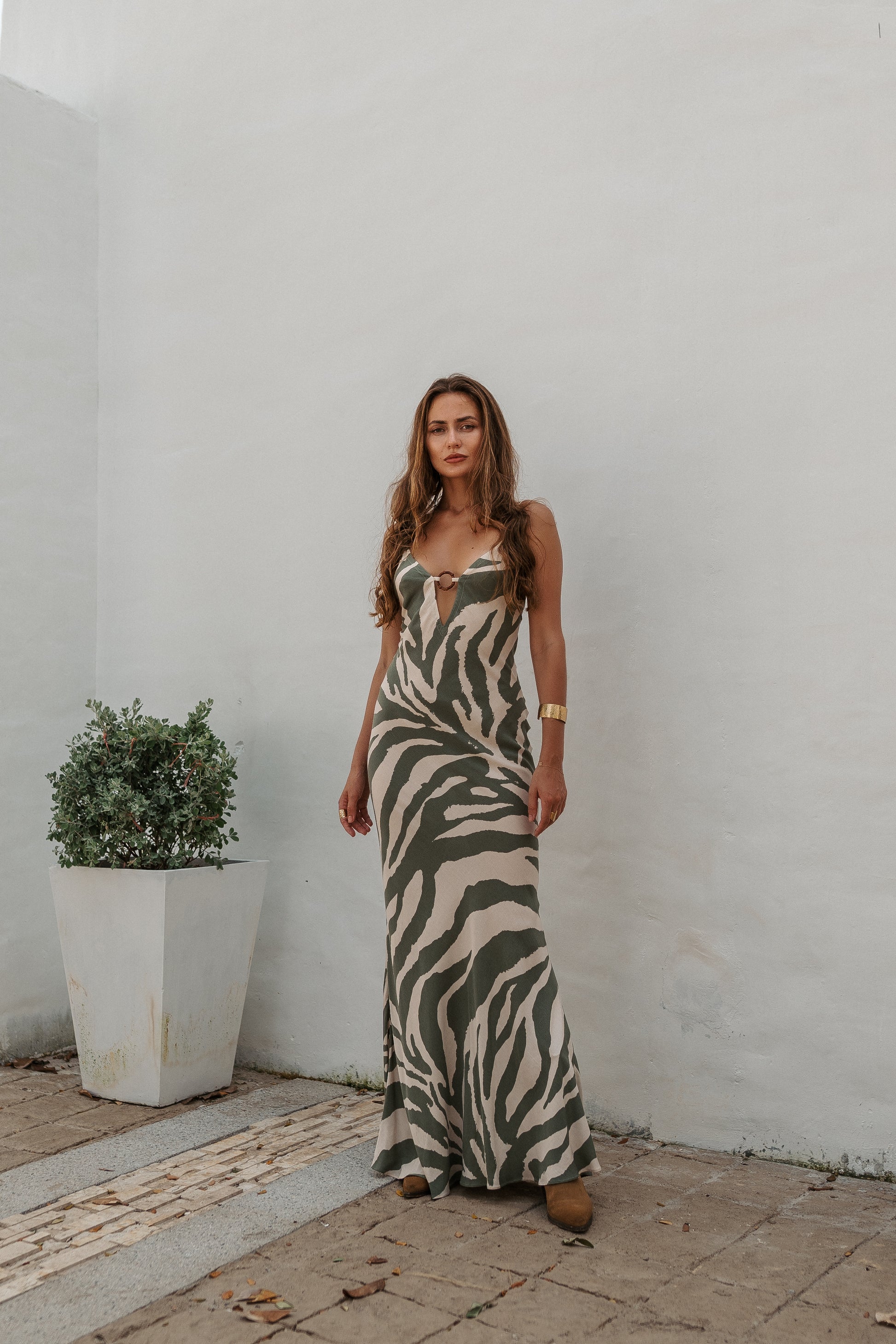Crafted from 100% sustainable viscose fabric, this dress combines style and eco-consciousness. Its natural flowing fabric drapes beautifully, ensuring a perfect fit for any body shape. The thin straps and open back add a touch of femininity, enhancing its overall appeal.