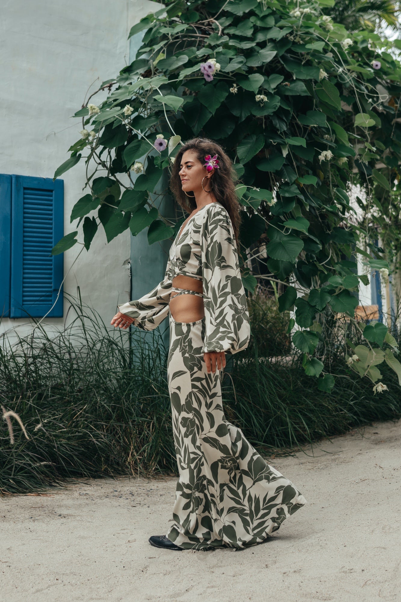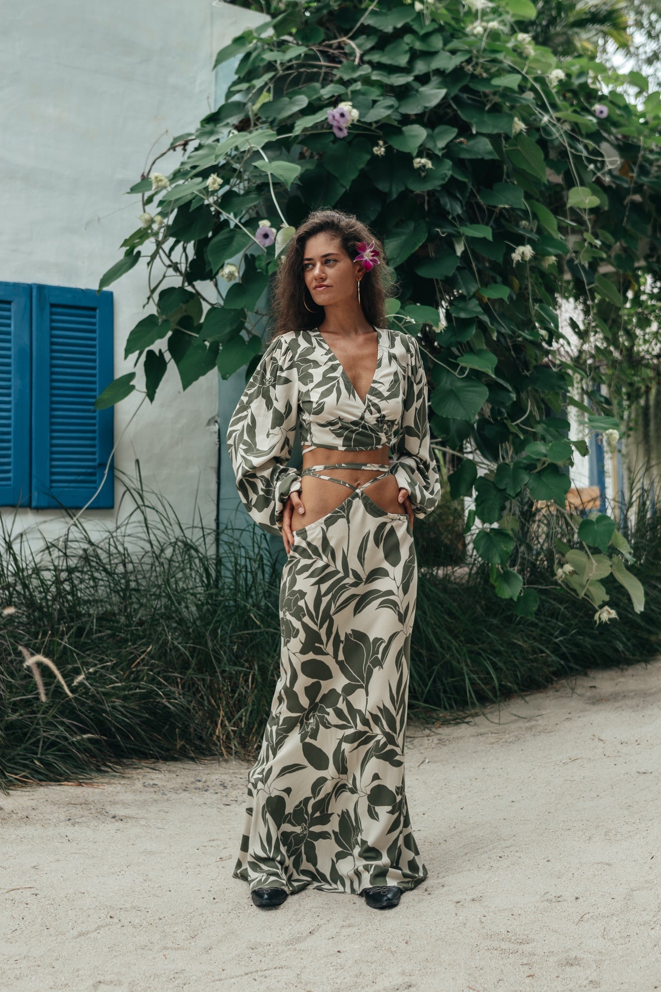 Viscose top with long sleeves. On a wrist it is collected on an elastic band. The top ties around the waist with a drawstring and has a V-shaped neckline at the bust.