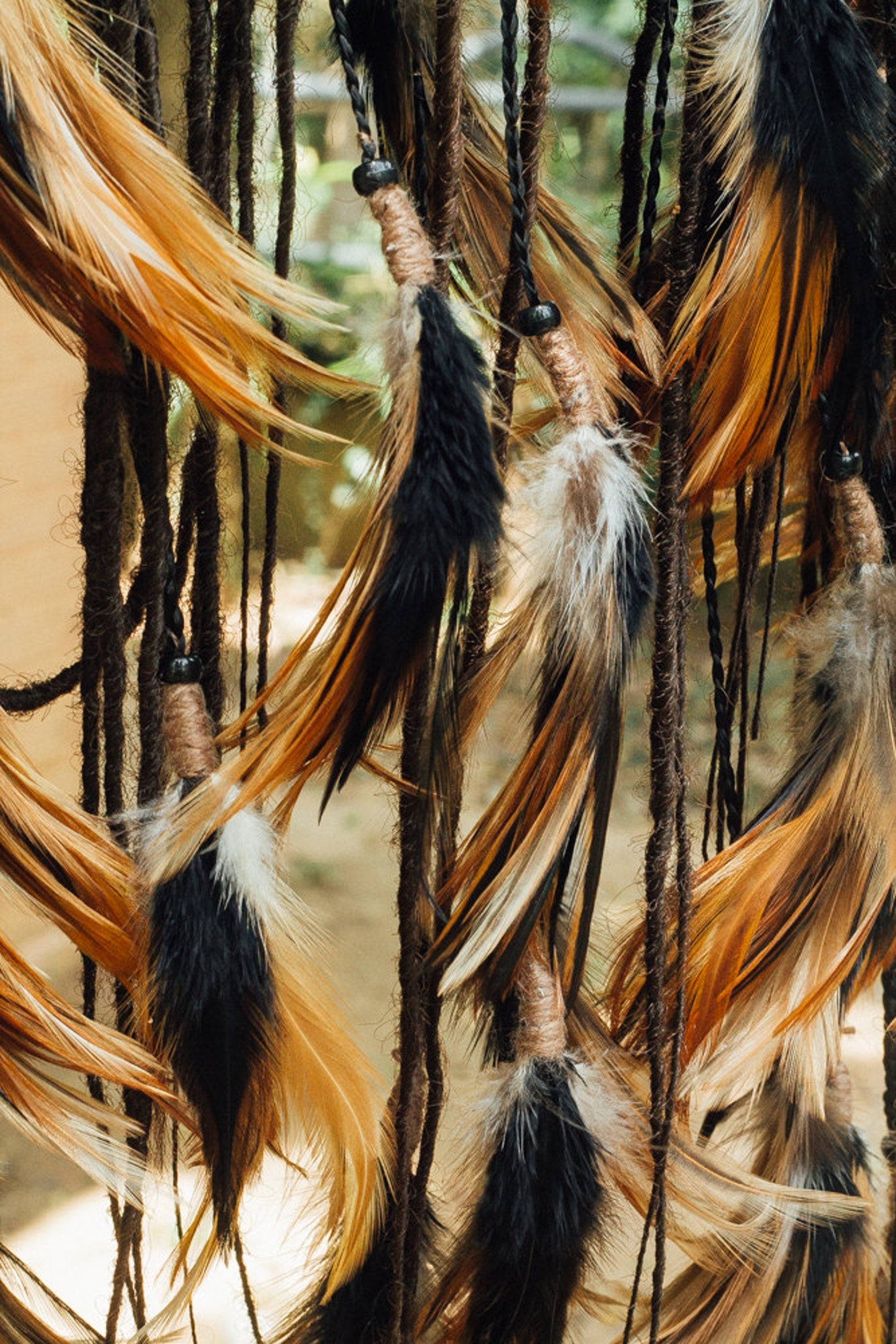 Beautiful handcrafted headband with natural feathers.Each of the feathers are attached to the braids made from synthetic hair material.It will give u desired volume and will complete any boho look.You can easily move all of the braids to get maximum effect of your headband. Free Size! Very light (around 75 grams)