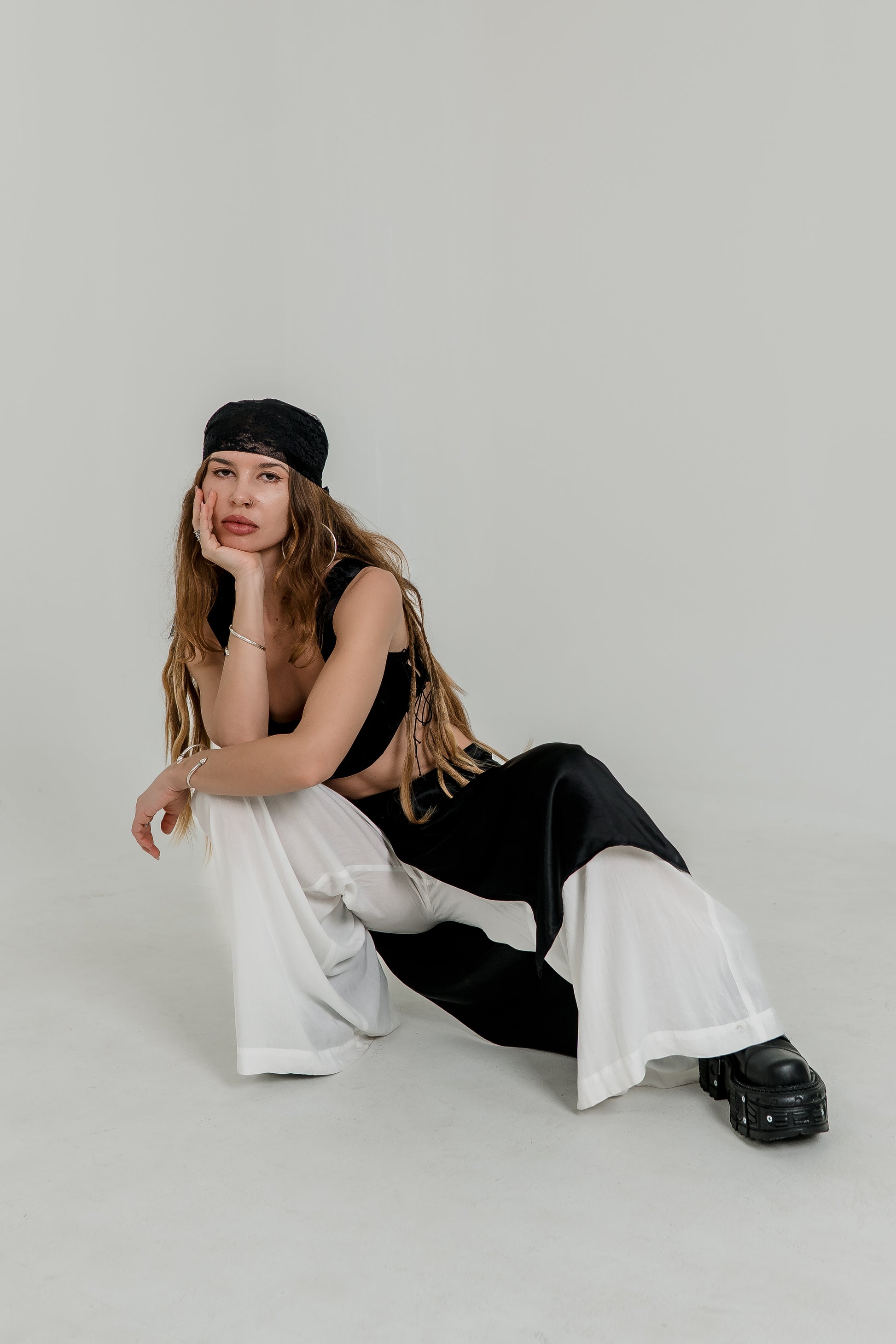 The crop top features adjustable side laces, allowing you to customize the fit while adding a contemporary cut-out detail. Paired with a matching high-waisted skirt, this set drapes fluidly along the body with a subtle sheen that enhances movement and shape. Breathable, vegan-friendly, and designed with intention — this is Mockniwear at its most refined.