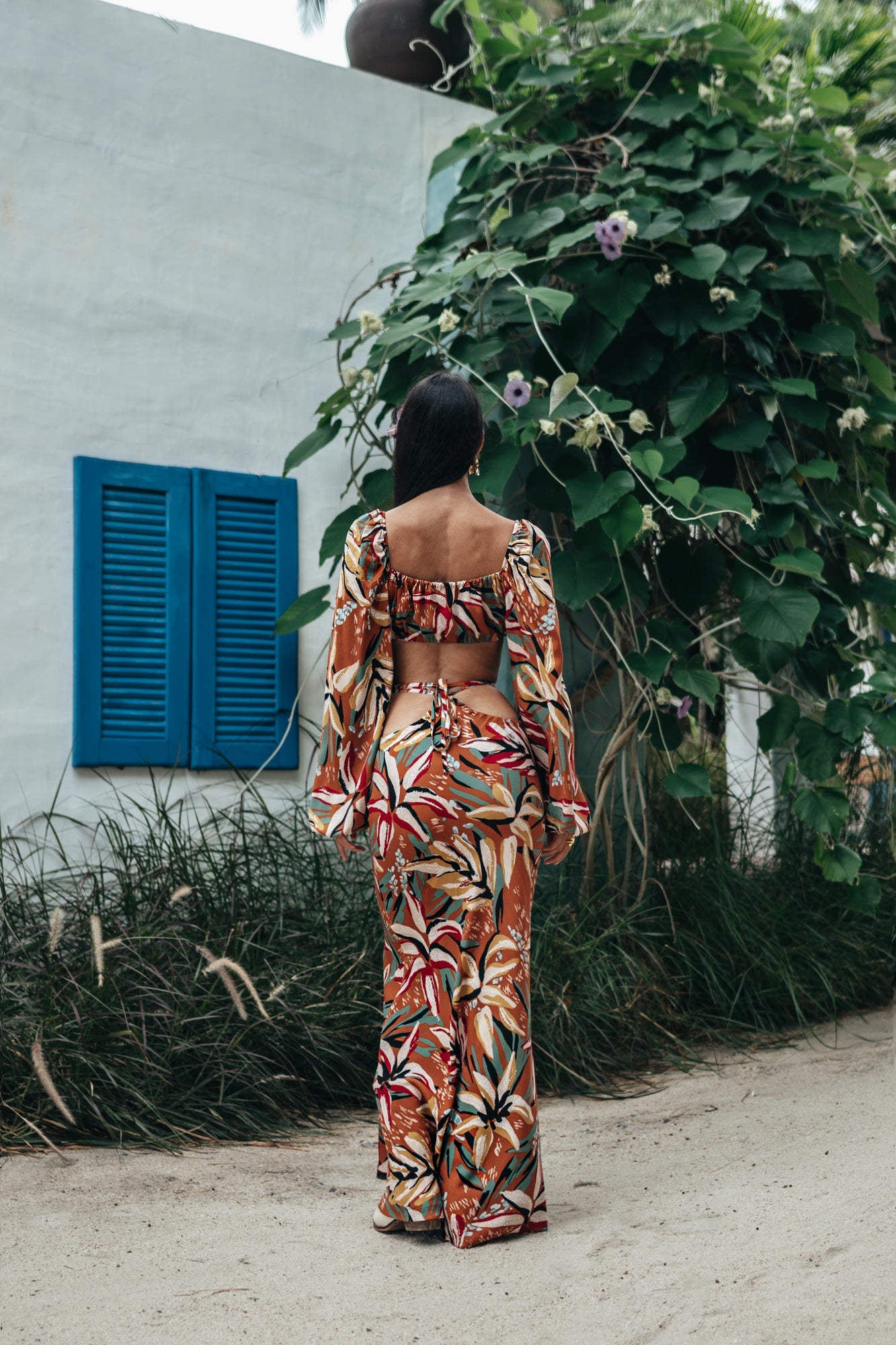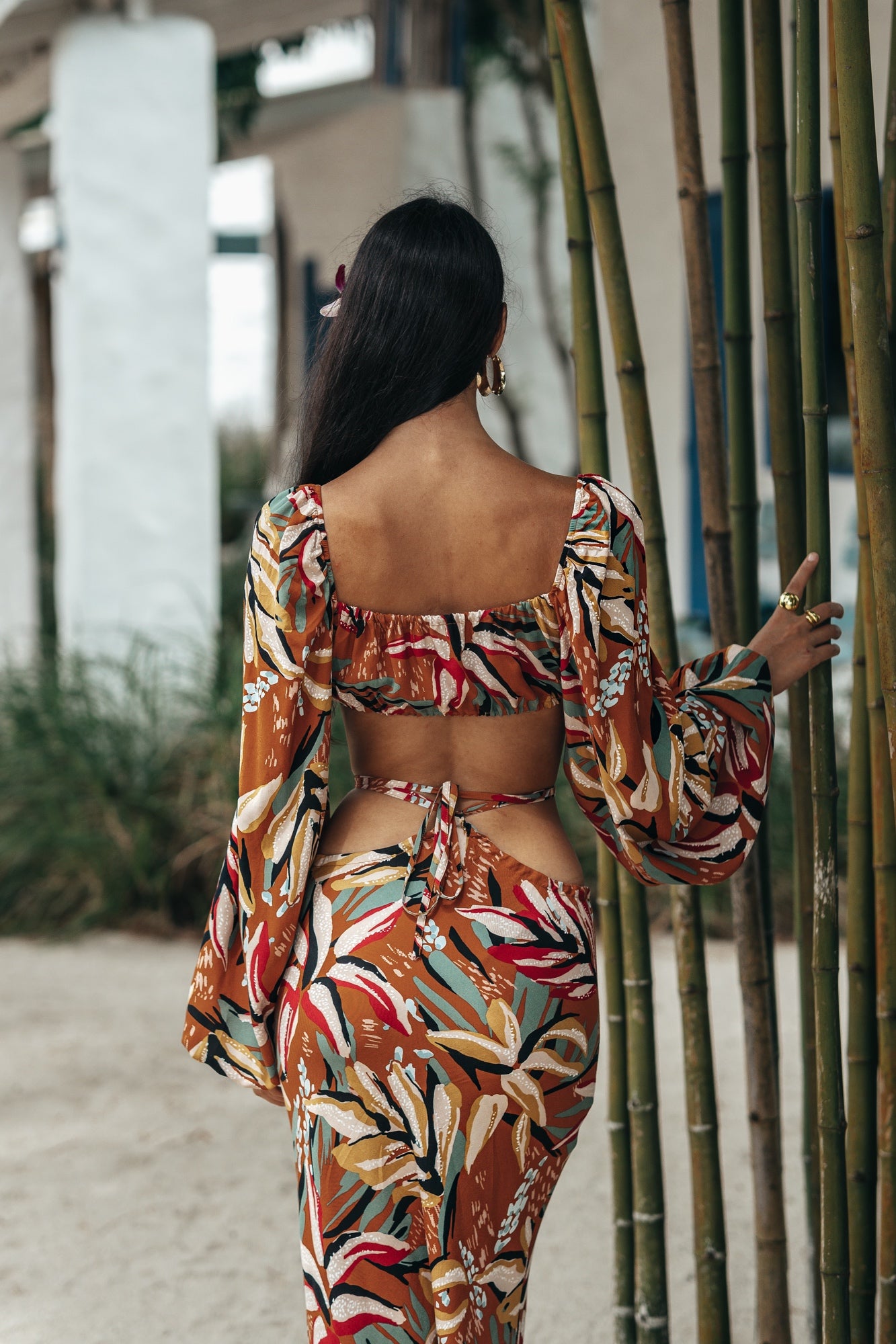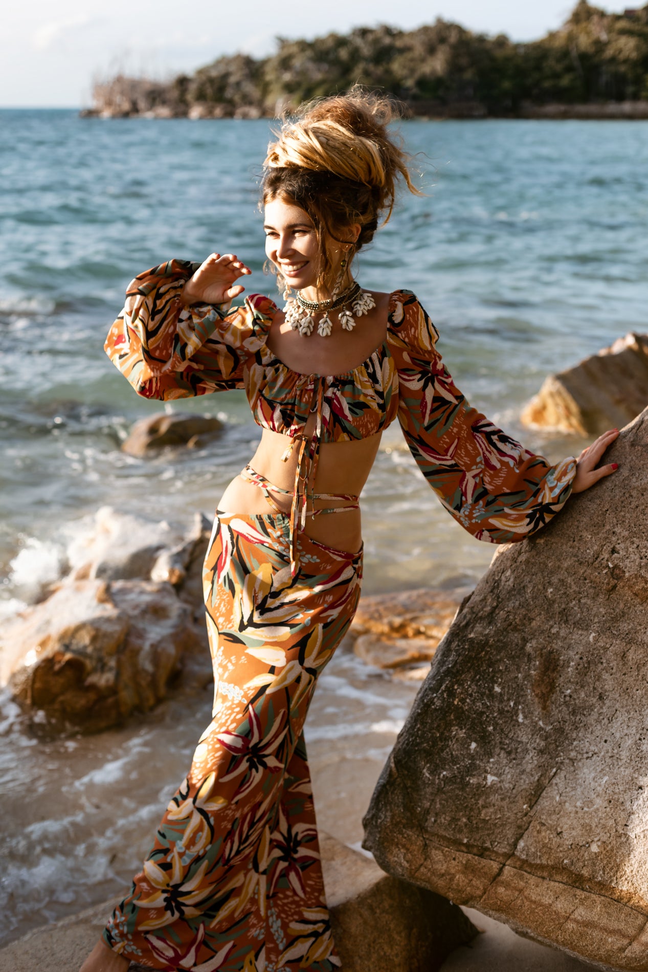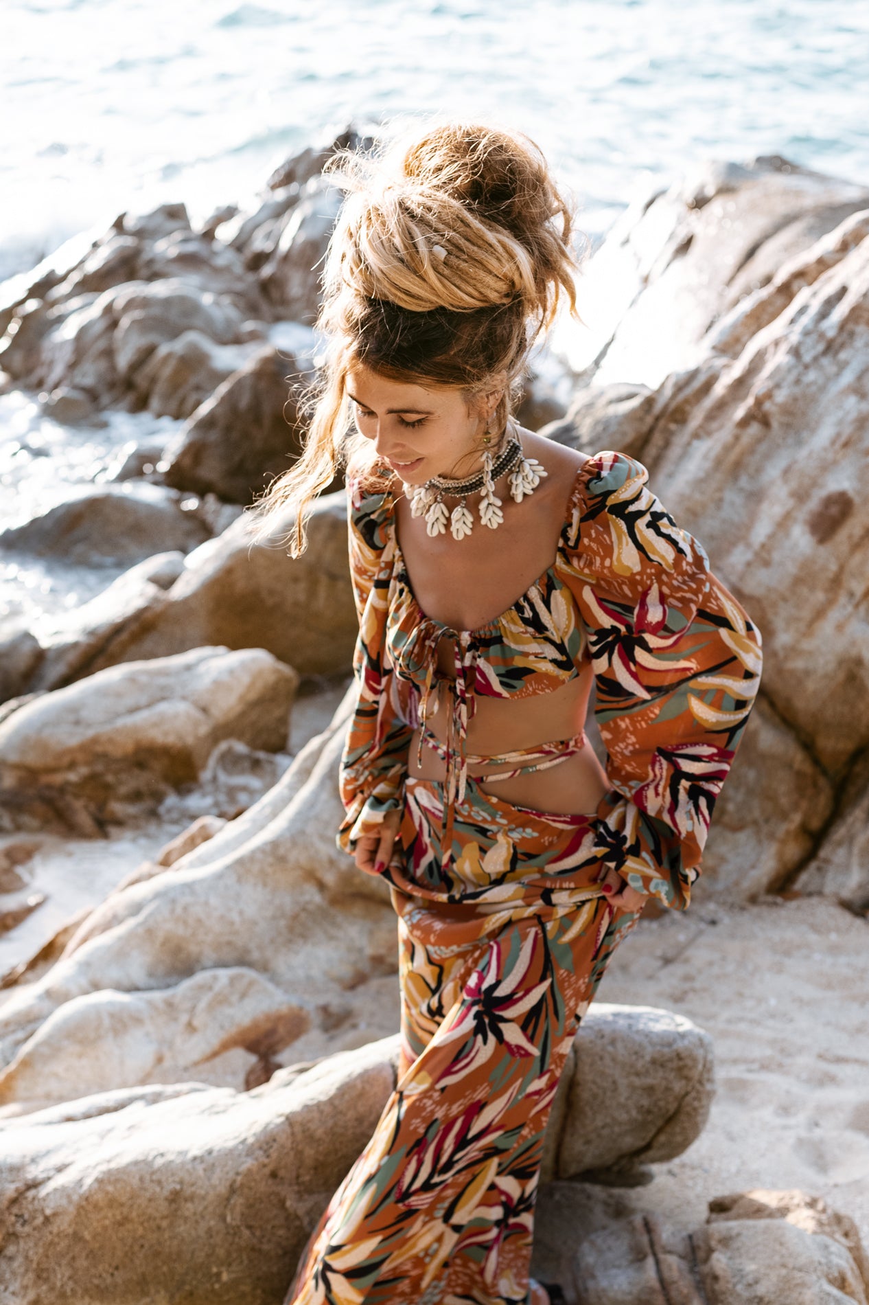 Viscose top with long sleeves. The top is tied at the front with laces. At the bottom of the top is an elastic band, this makes it as comfortable as possible and suitable for all sizes.
