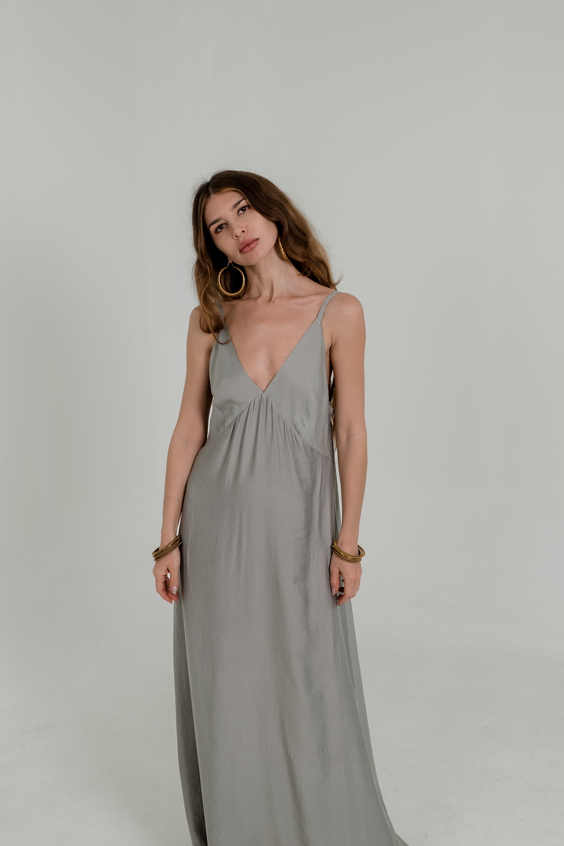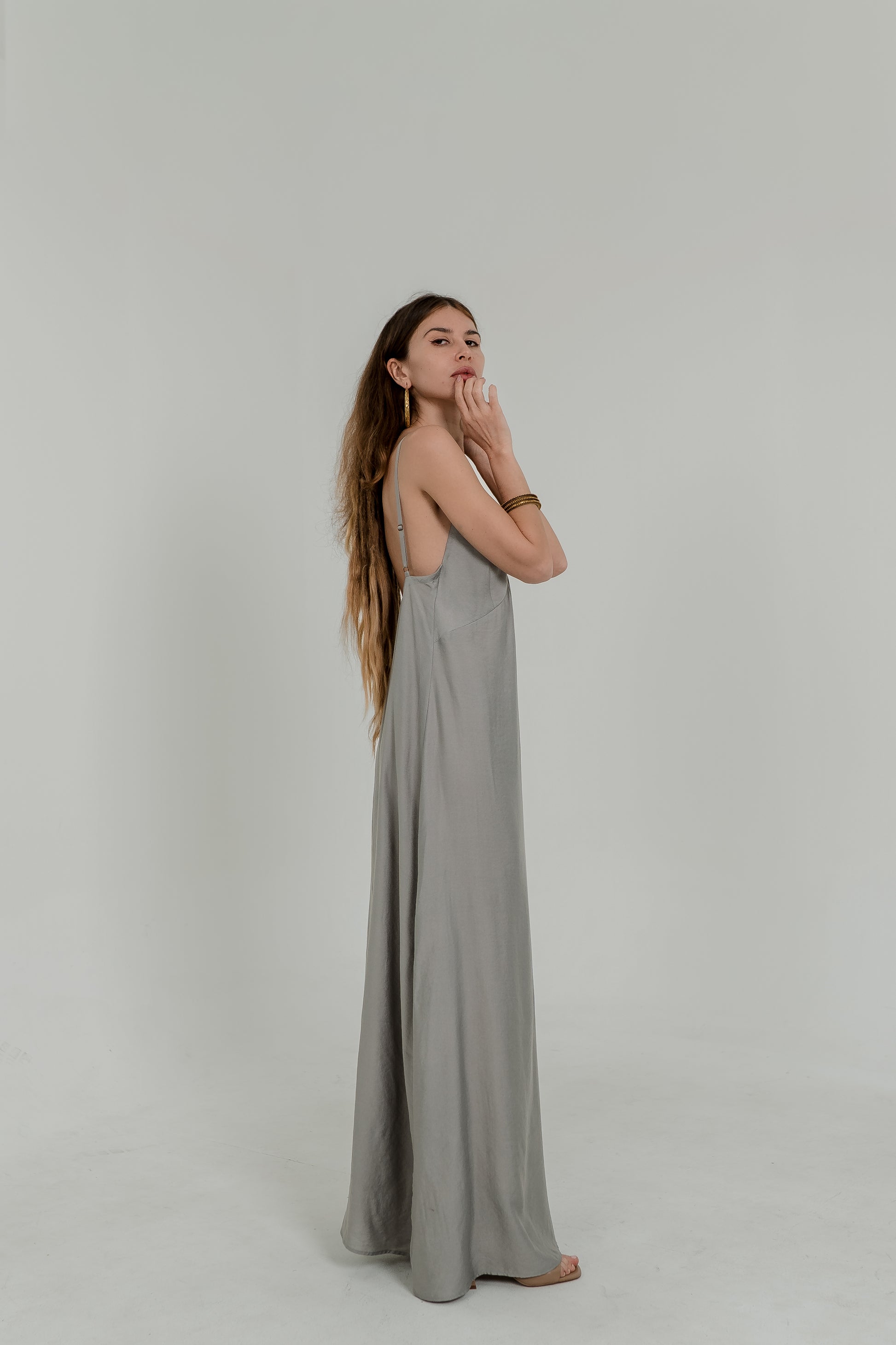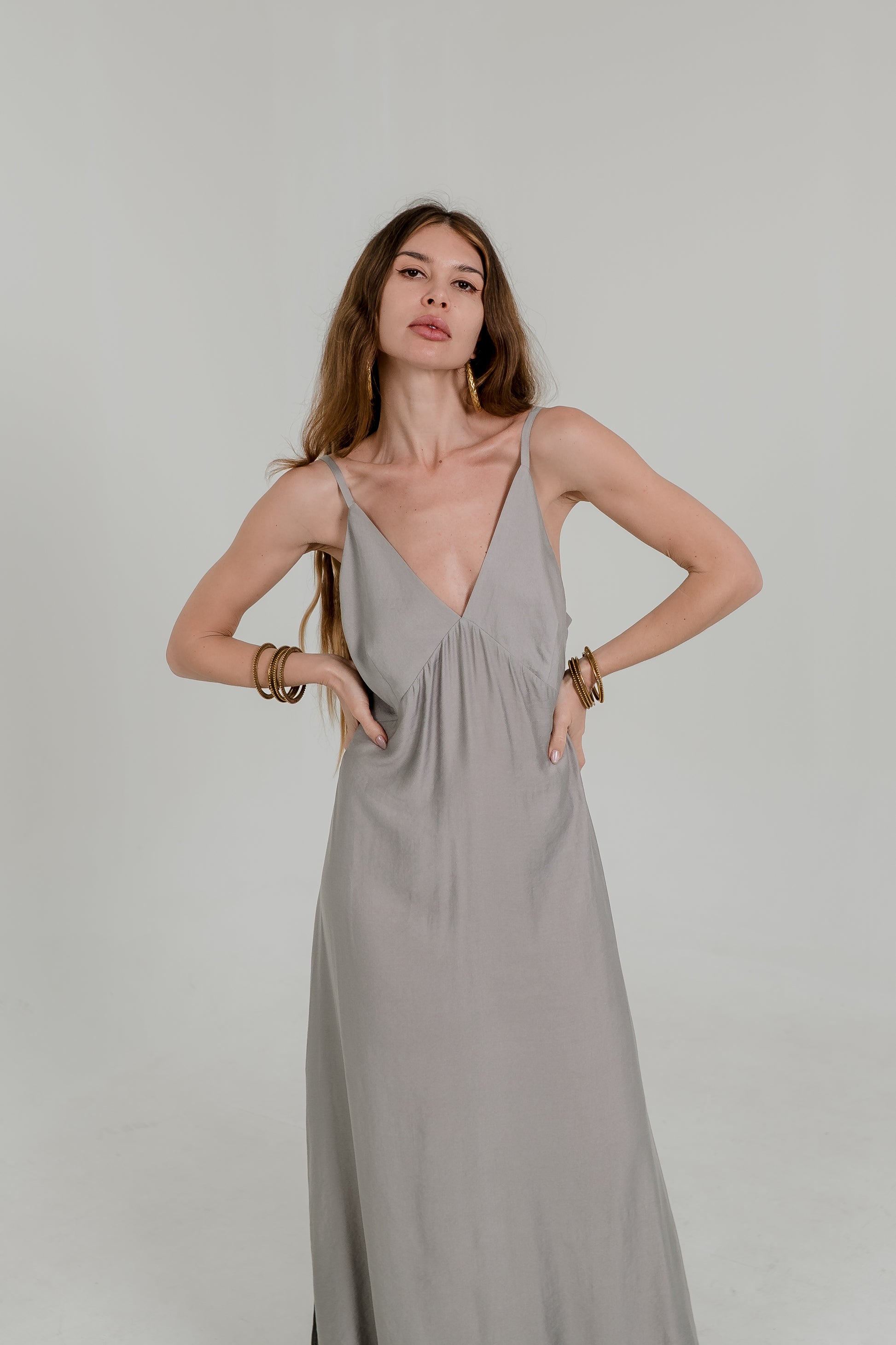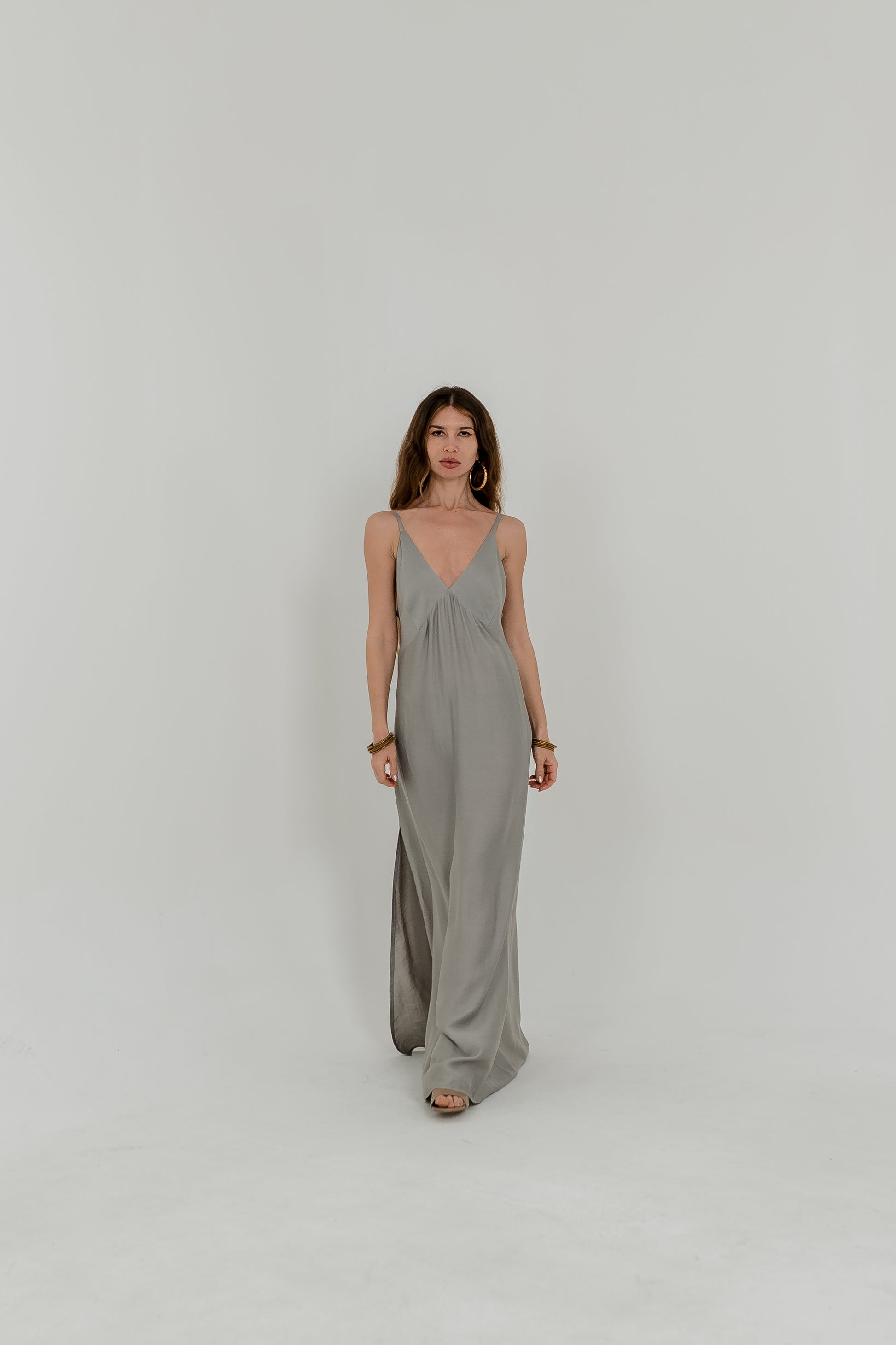 A flowing grey maxi dress crafted from soft viscose with an open adjustable back and a subtle side slit. Effortless, minimal, and beautifully feminine.