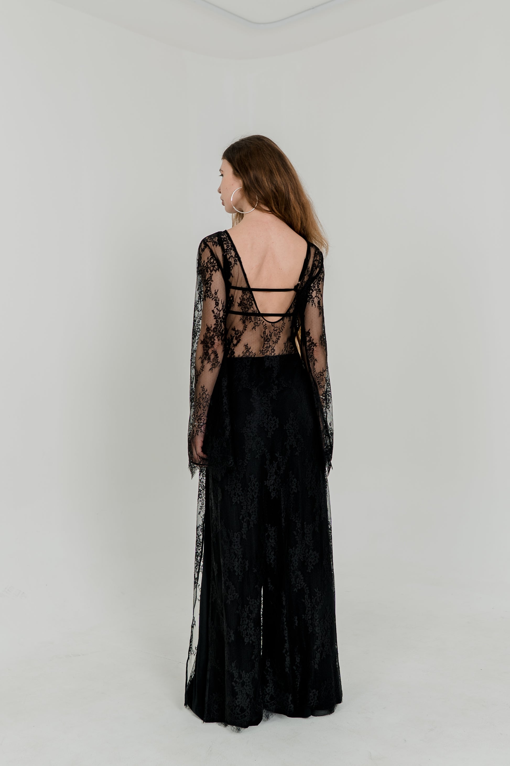 The sheer bodice and sleeves add an air of mystery, while the open back with minimalist straps brings modern sensuality to the design. Long flared sleeves echo classic eveningwear, giving the piece a soft, flowing rhythm as you move.