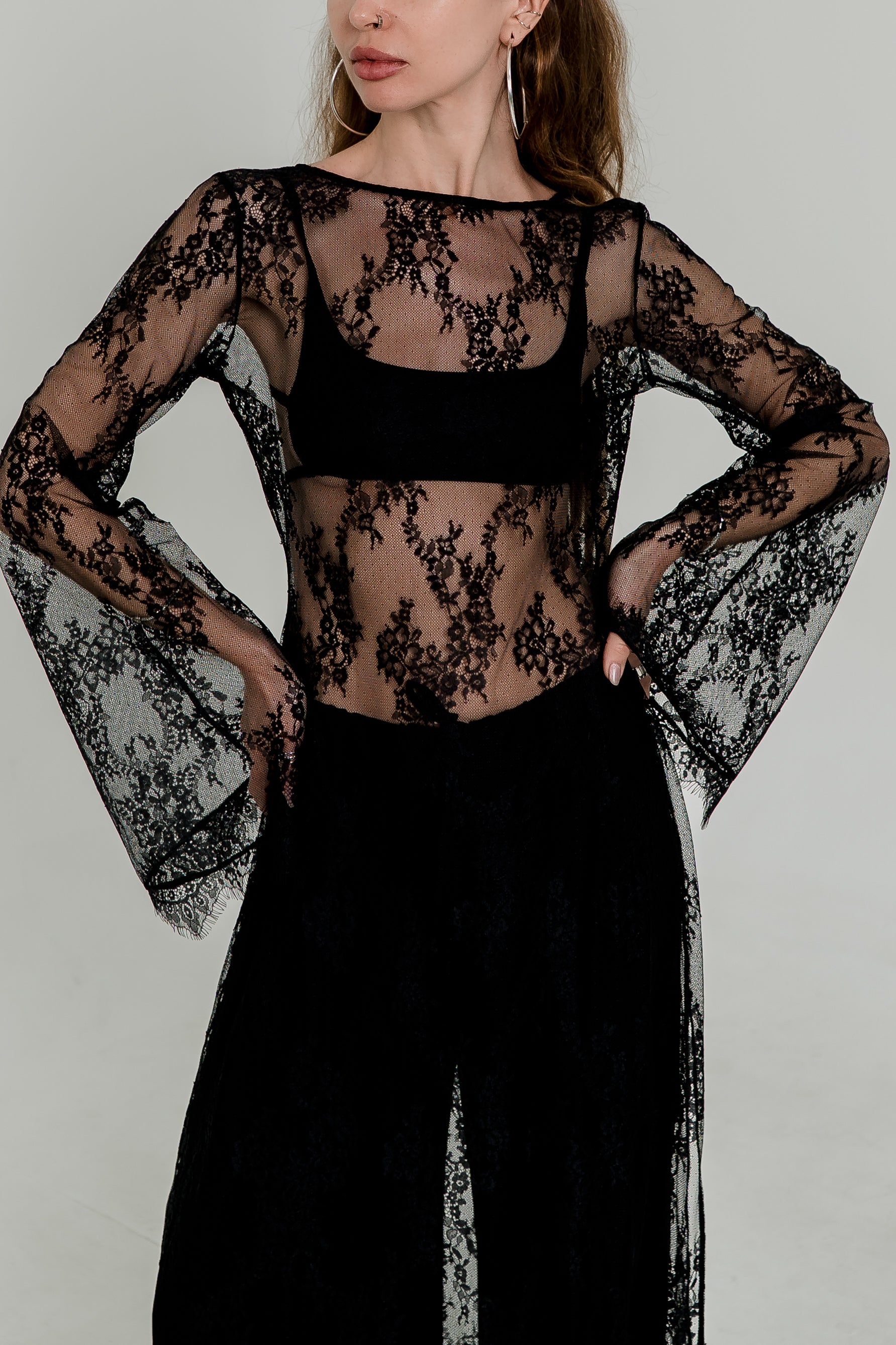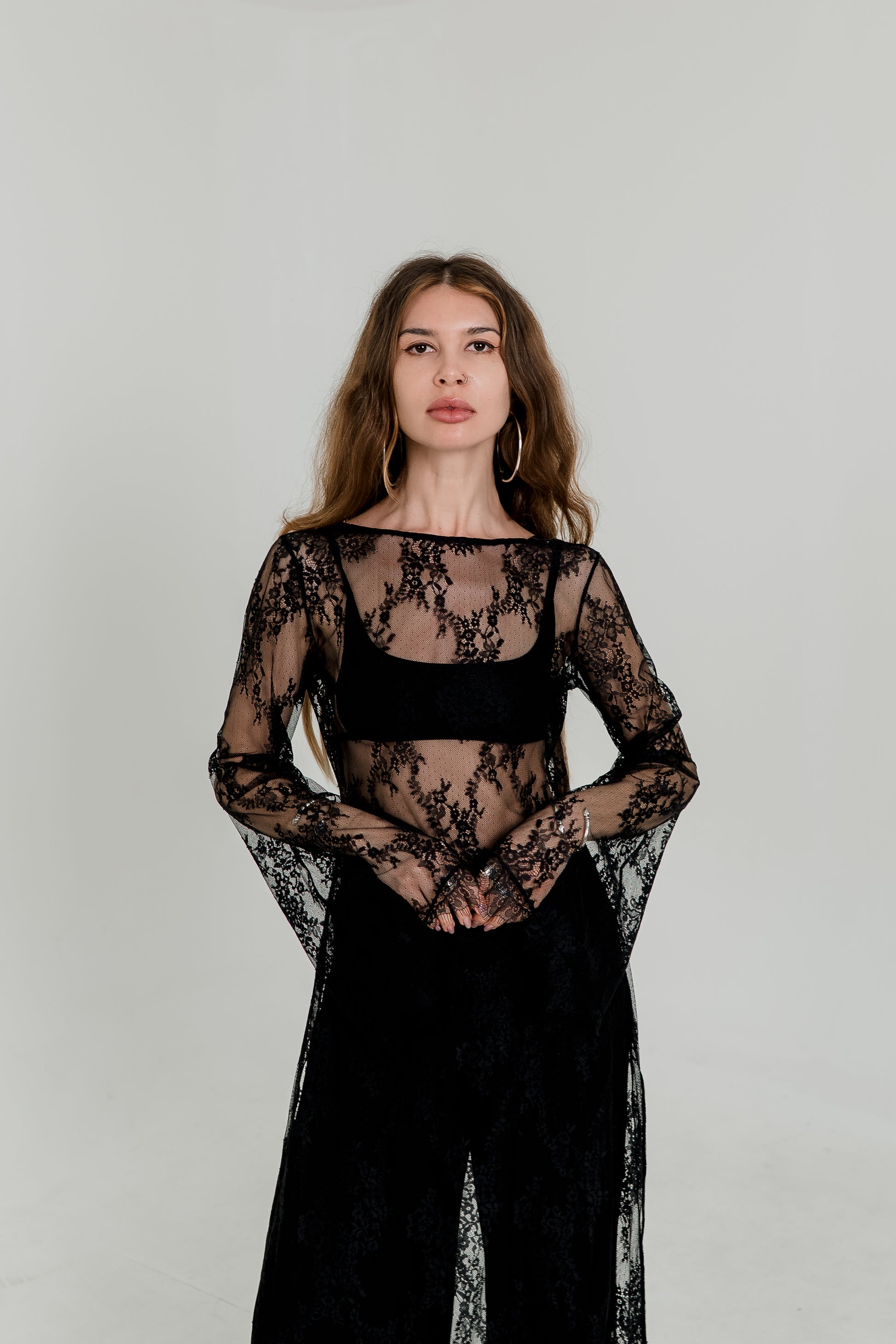 A sheer, ethereal lace maxi dress crafted for bold, elegant evening styling — dramatic, romantic, and effortlessly refined.