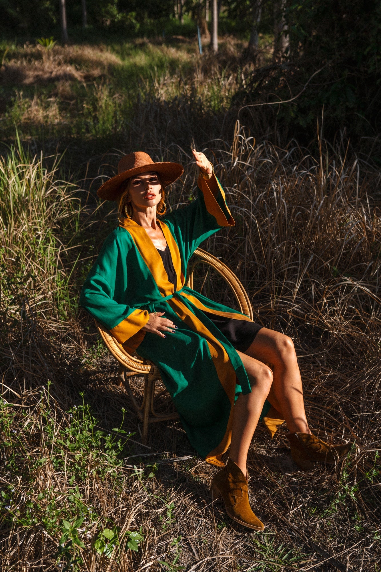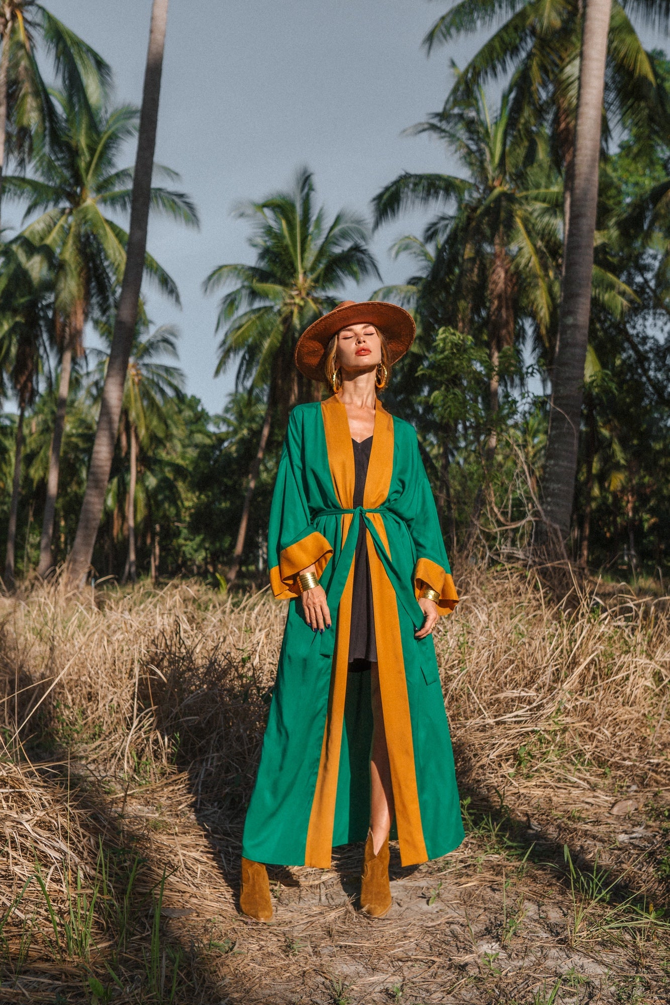Our maxi kimono is expertly crafted from luxurious, high-quality polished viscose fabric, giving it a stunning, radiant sheen. This kimono features wide, eye-catching cuffs that add a touch of sophistication to its design. You have the option to cinch it with the included belt for a tailored look or wear it open for a more relaxed and flowing style