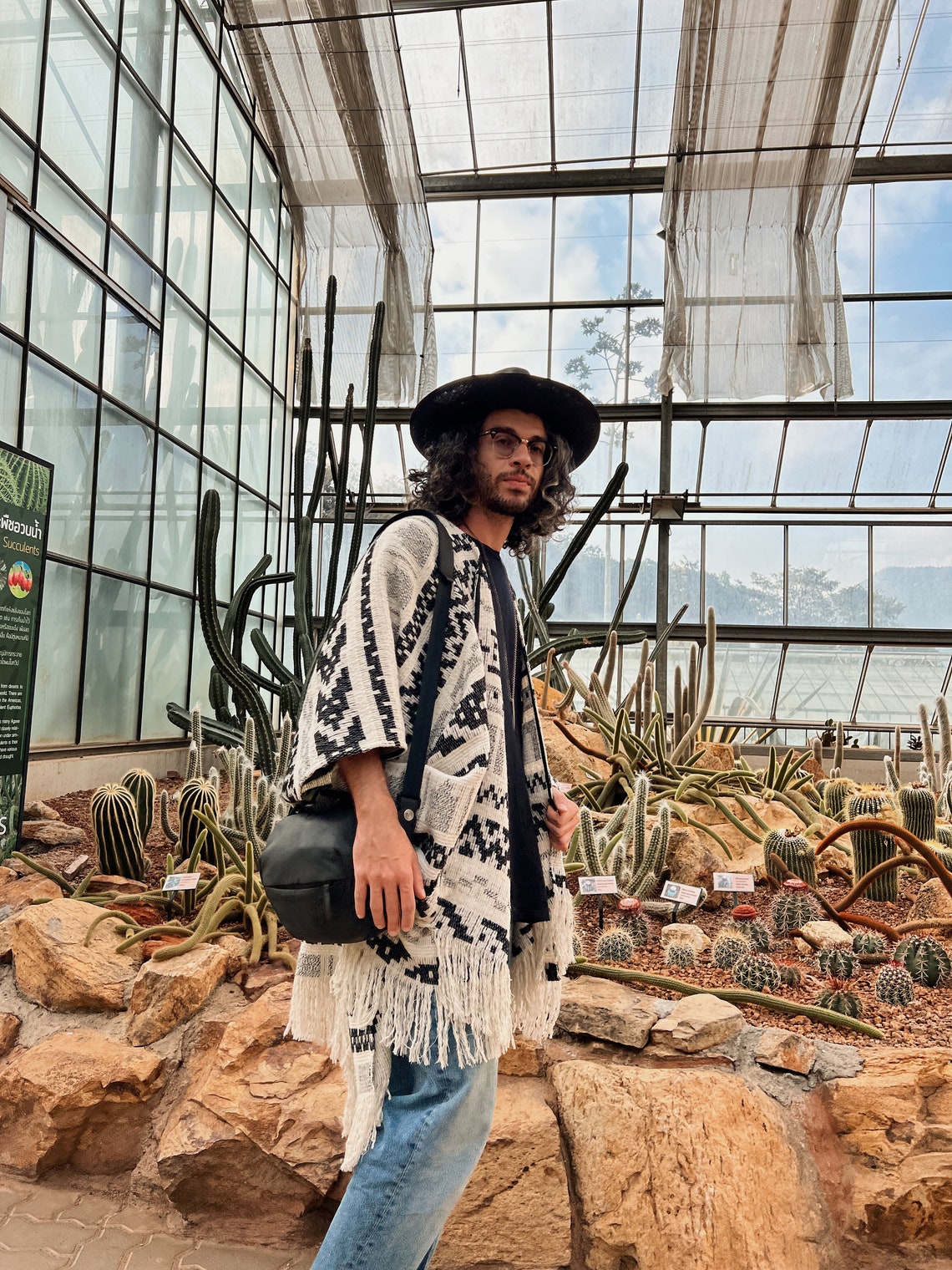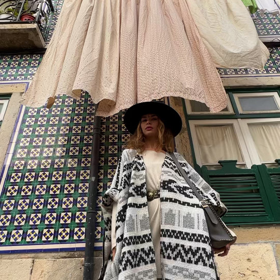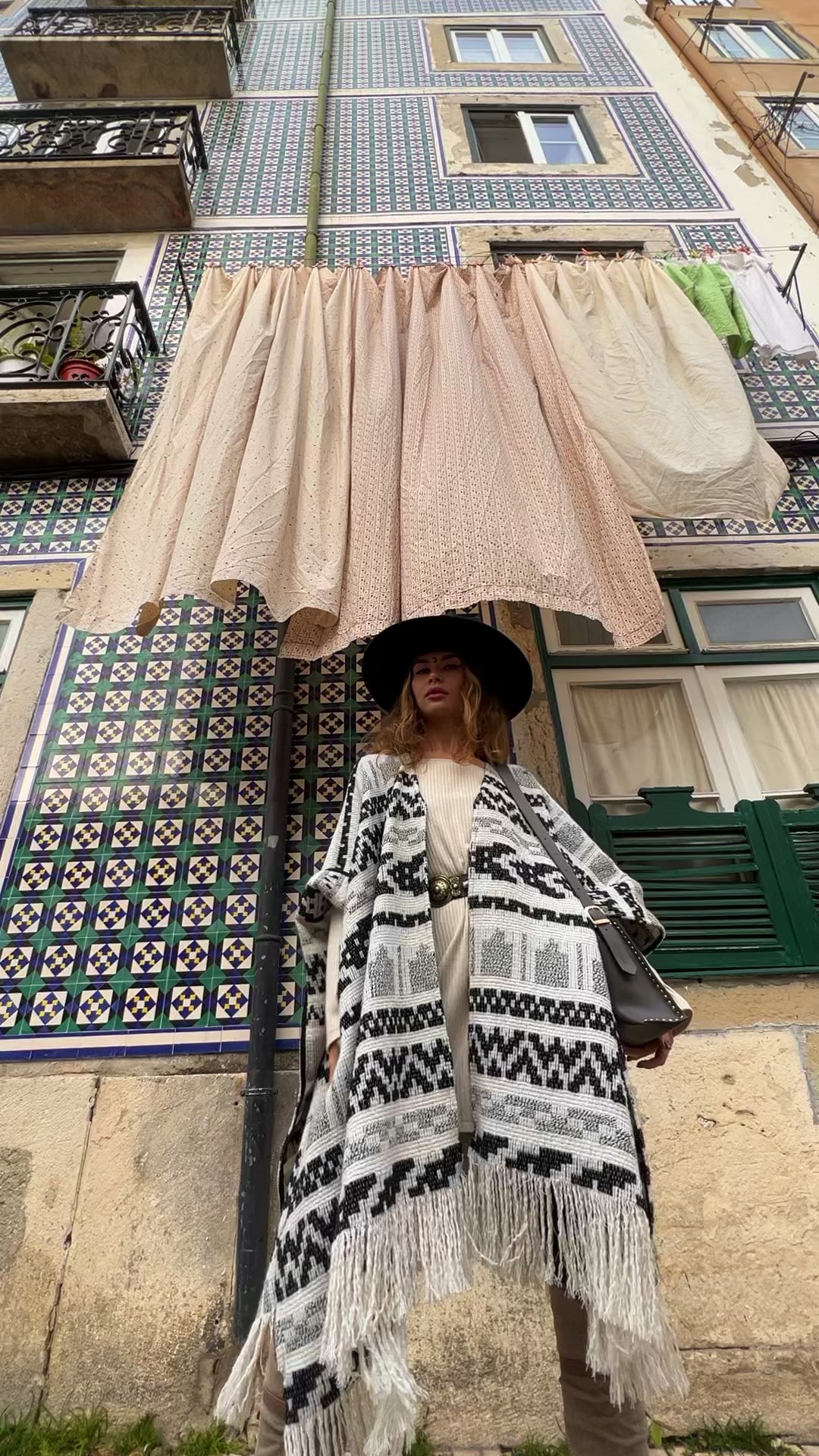 Unisex adult poncho with fringe and ethnic print/pattern. Ideal for any season and travel.
