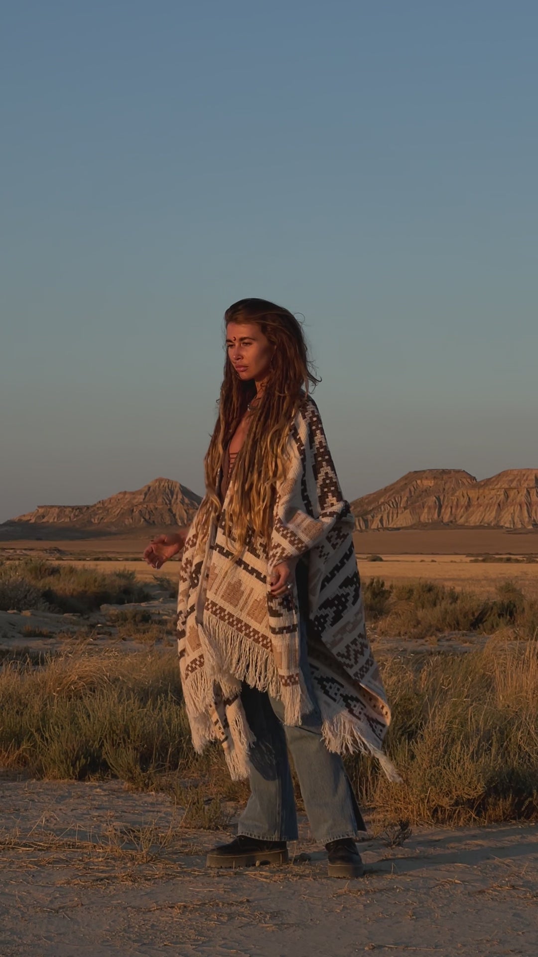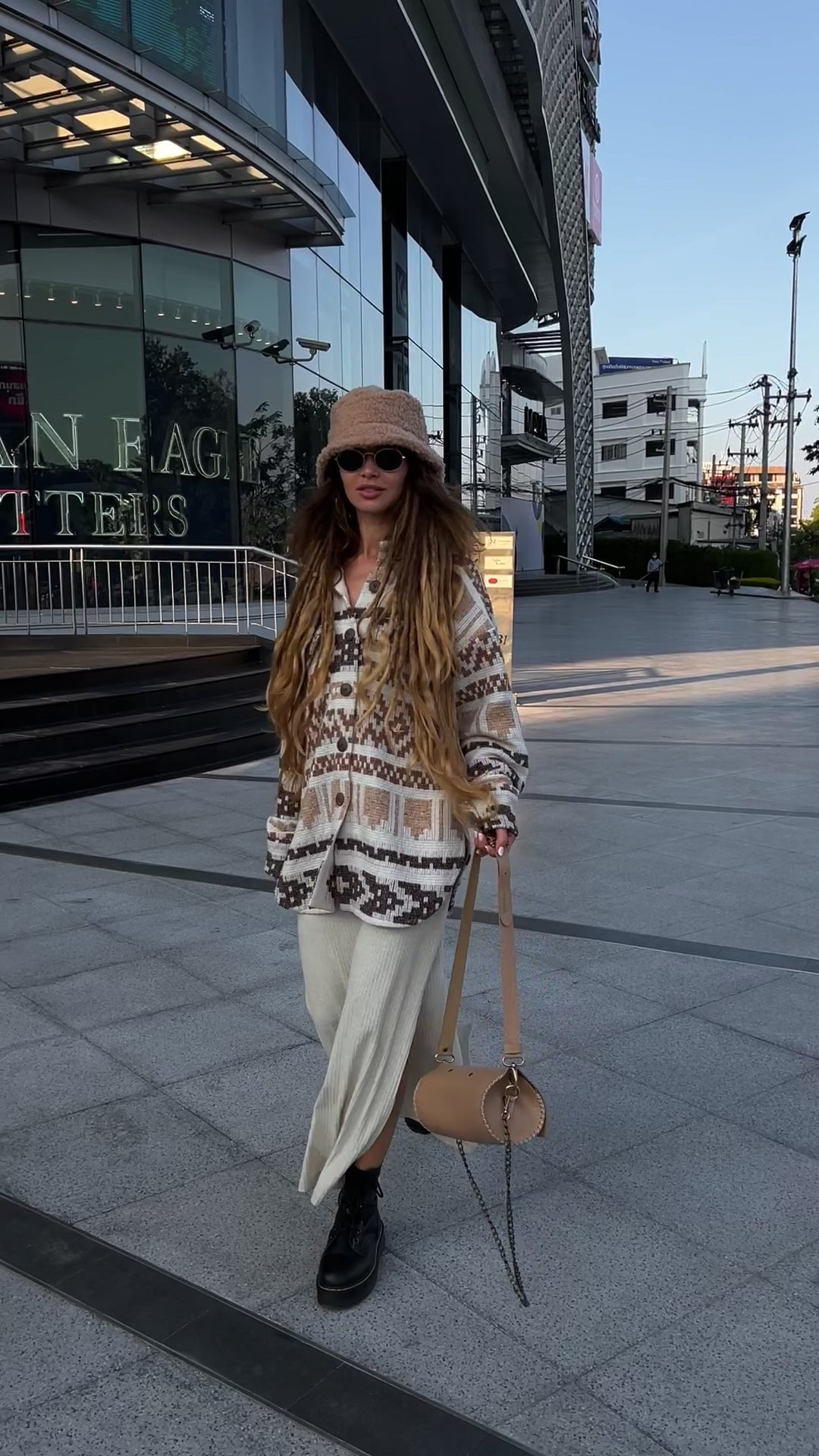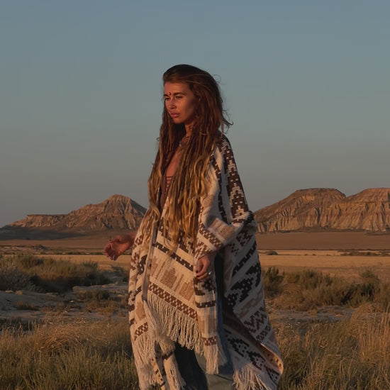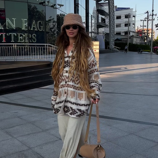 A woollen warm coat/jacket is perfect for cool weather, traveling or an evening walk. There are buttons on the front of the shirt, which allow you to wear it buttoned or unbuttoned. On the sides in the chest area are large pockets with a buttons.