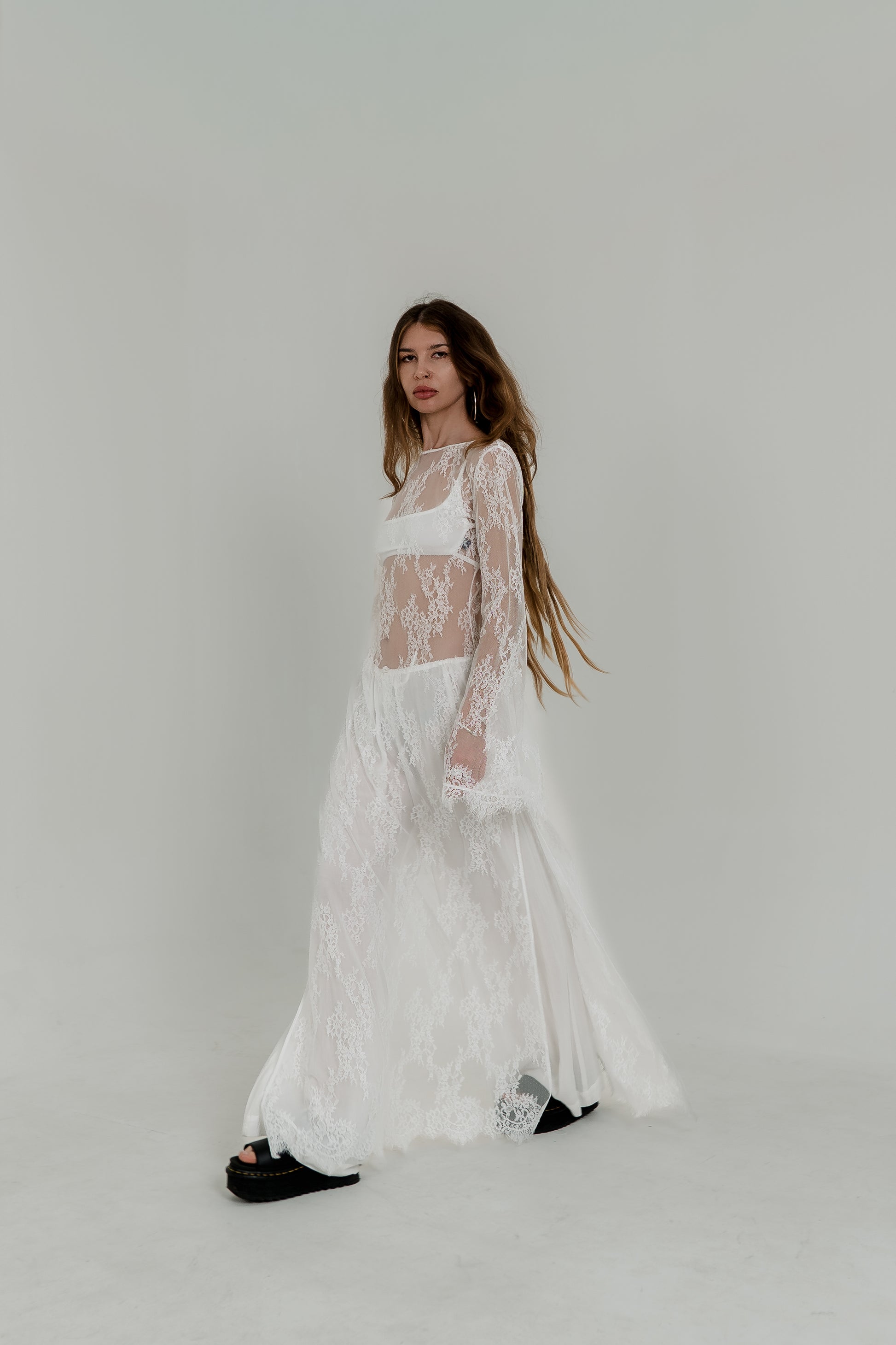 Featuring long flared sleeves, a soft scoop neckline, and an open back with refined strap detailing, this piece enhances the natural form with minimal structure and maximum impact. Its full-length sheer design allows playful layering — wear it over a bikini set for resort styling, over a slip for evening wear, or over lingerie for a daring editorial look.