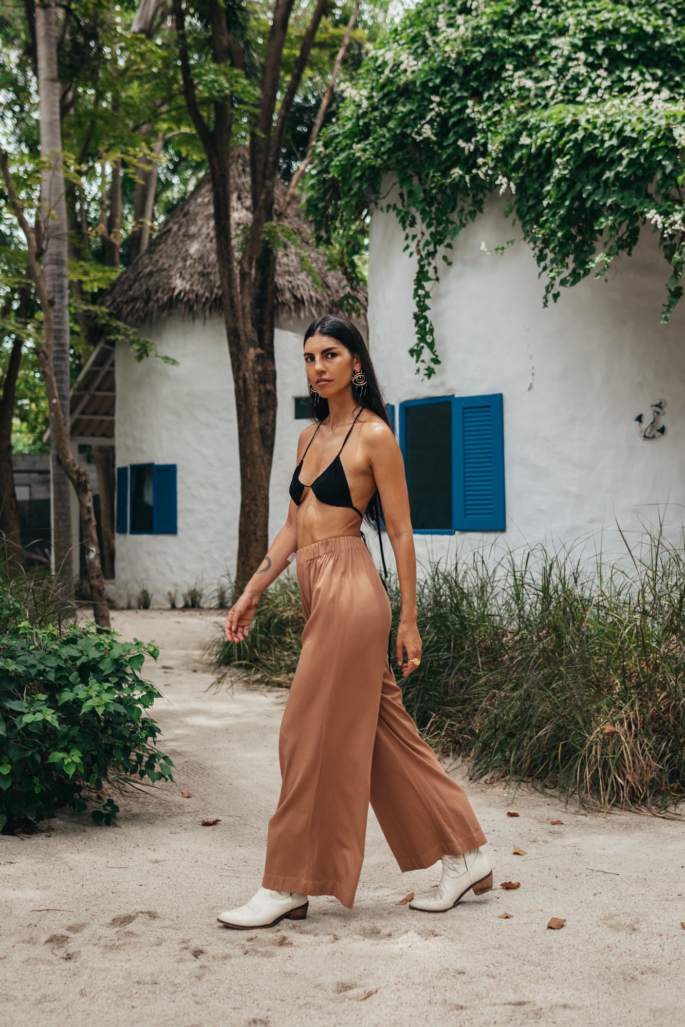 Women's light trousers, made out of stylish viscose fabric in black color. High waist and flared style pants.