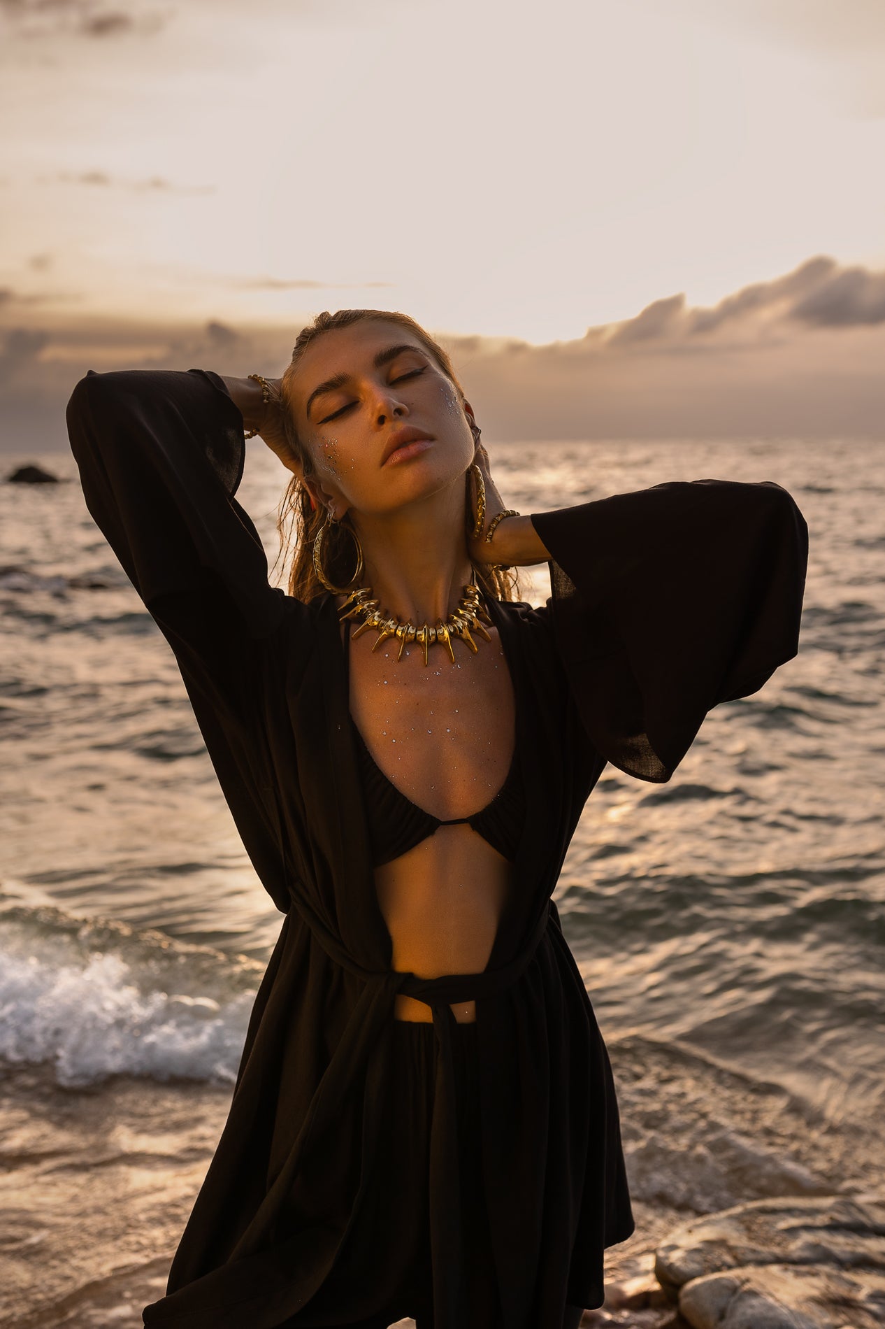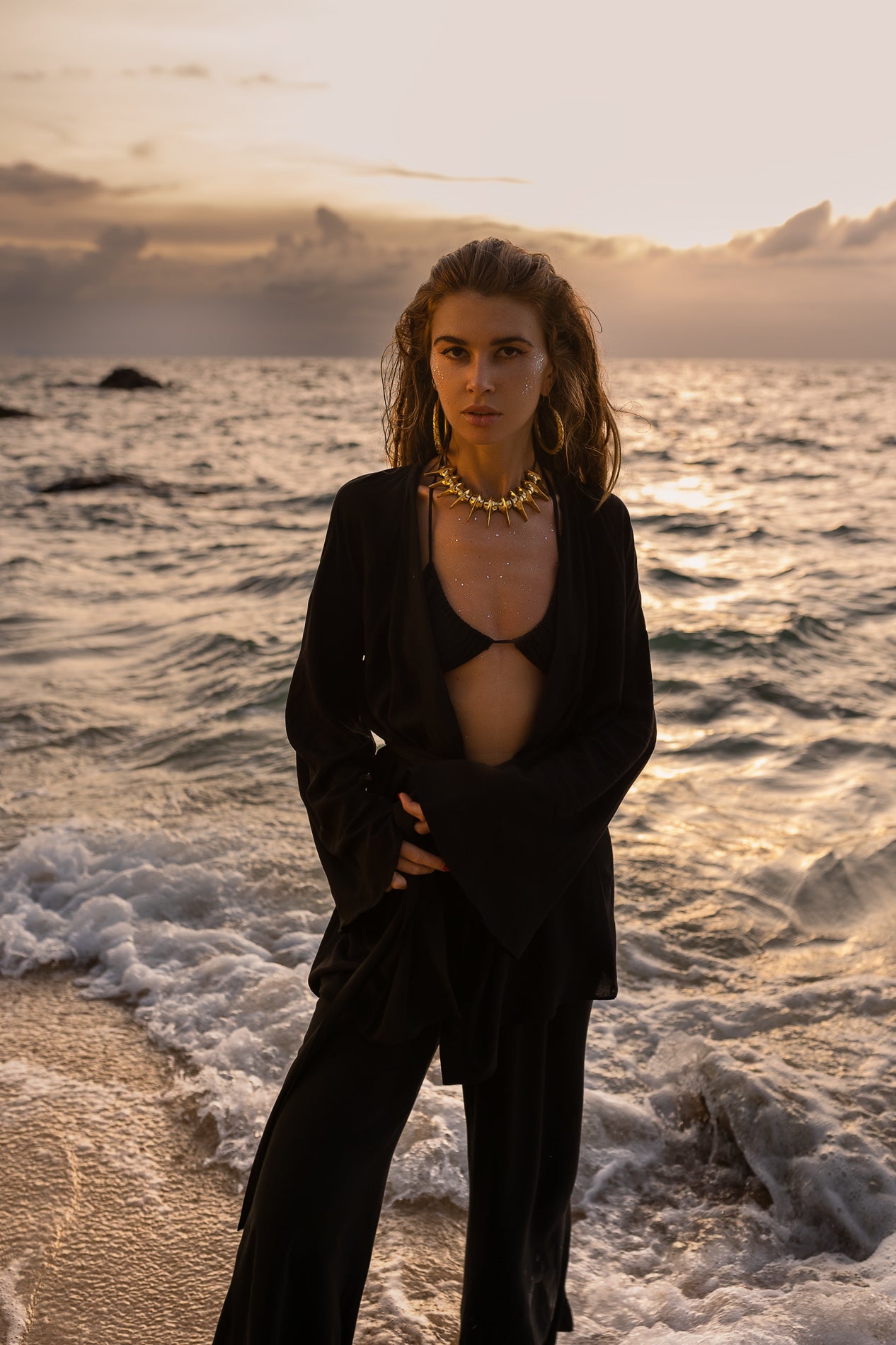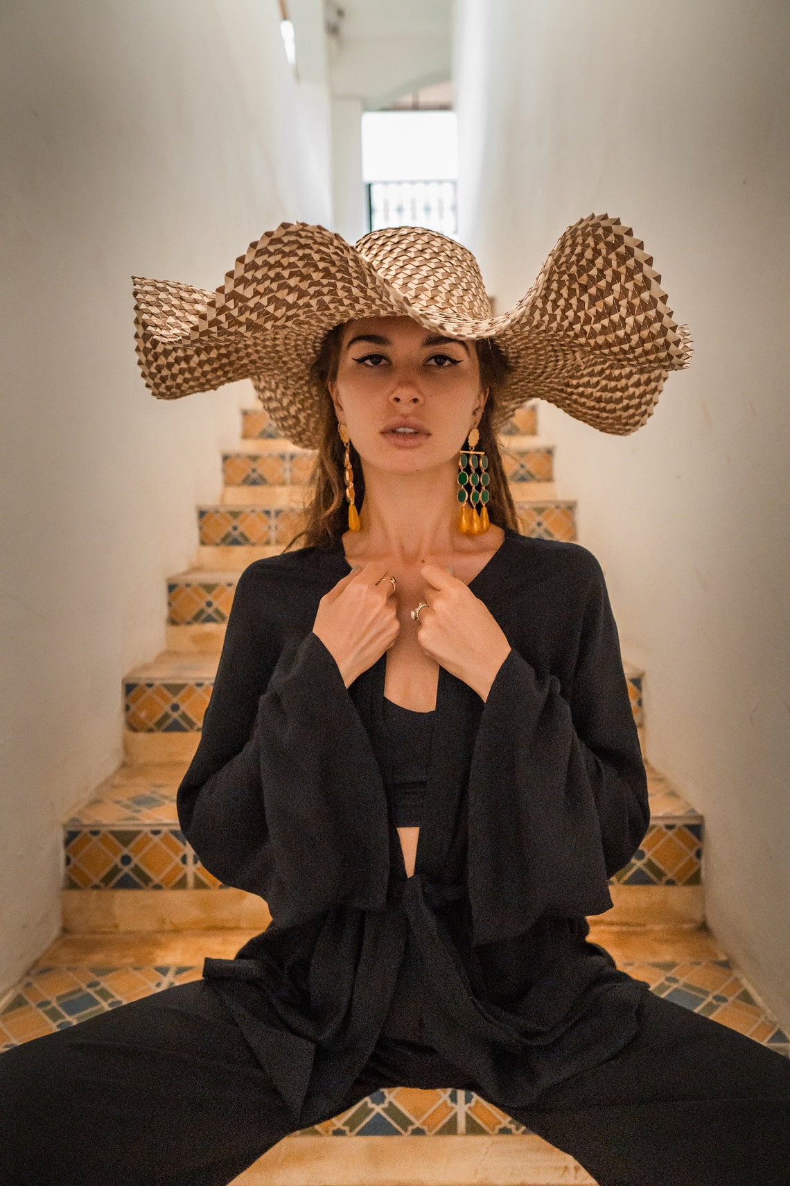 Our black viscose kimono is so gentle and light, the pants\trousers are made from the same quality fabric with flared bottom.