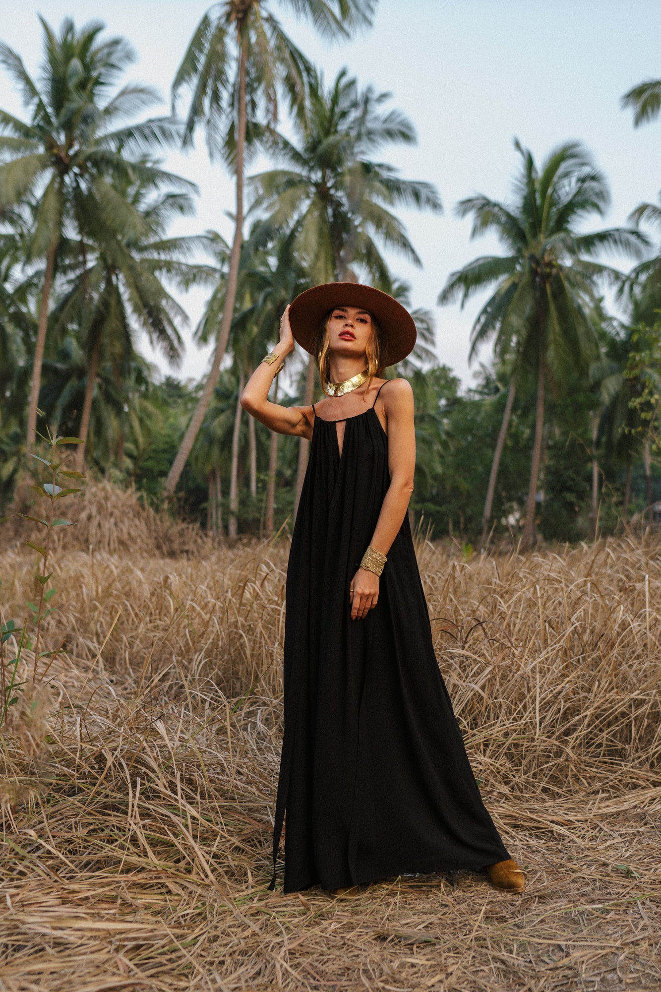 Introducing our Divine Wide Dress in black. This flared dress features an alluring open back design that adds a touch of elegance to your look. The adjustable straps ensure a perfect fit, and there are two ribbons on the front of the dress that can be tied like a belt for added style. Crafted from refined viscose cambric, this dress is lightweight and airy, offering a comfortable and breezy feel.