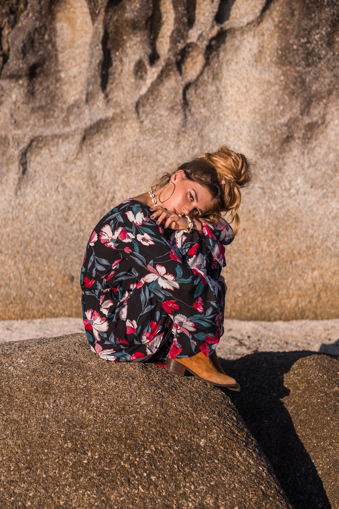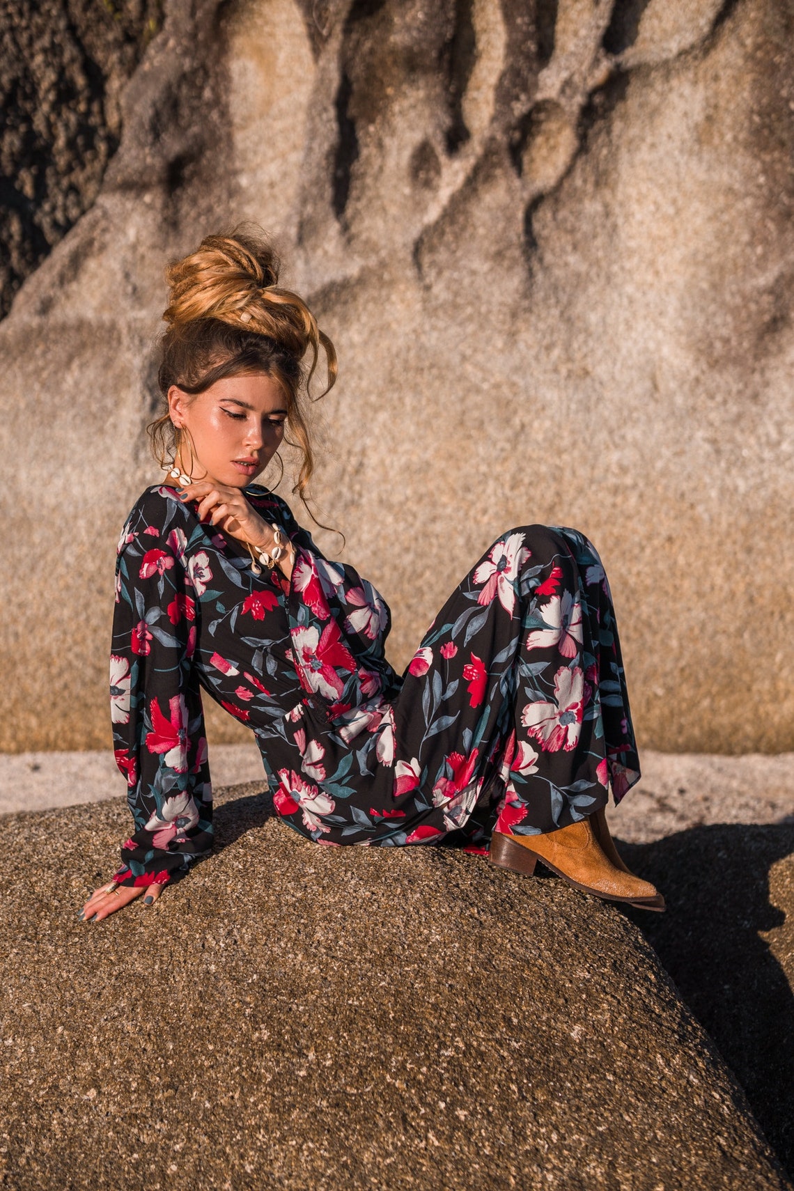 Women maxi black dress with flared sleeves | Women black dress with floral print | Black maxi viscose women dress with slits | Elegant dress
