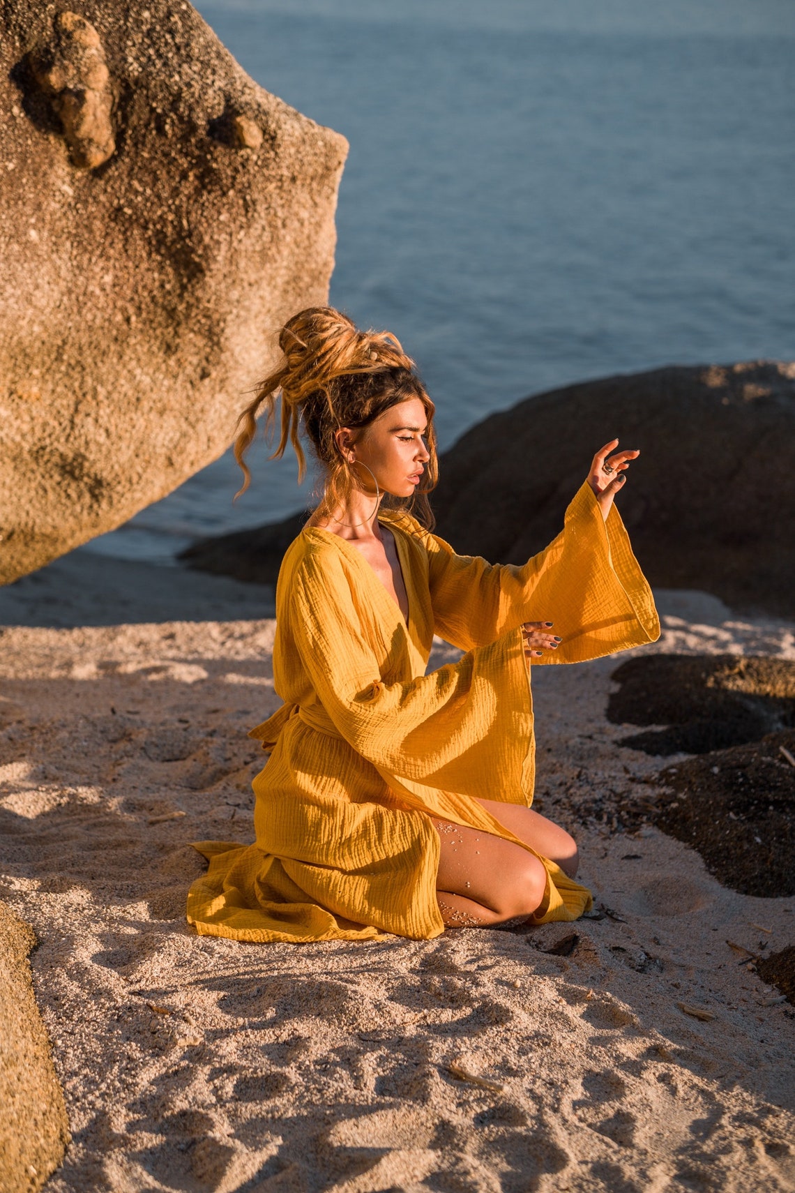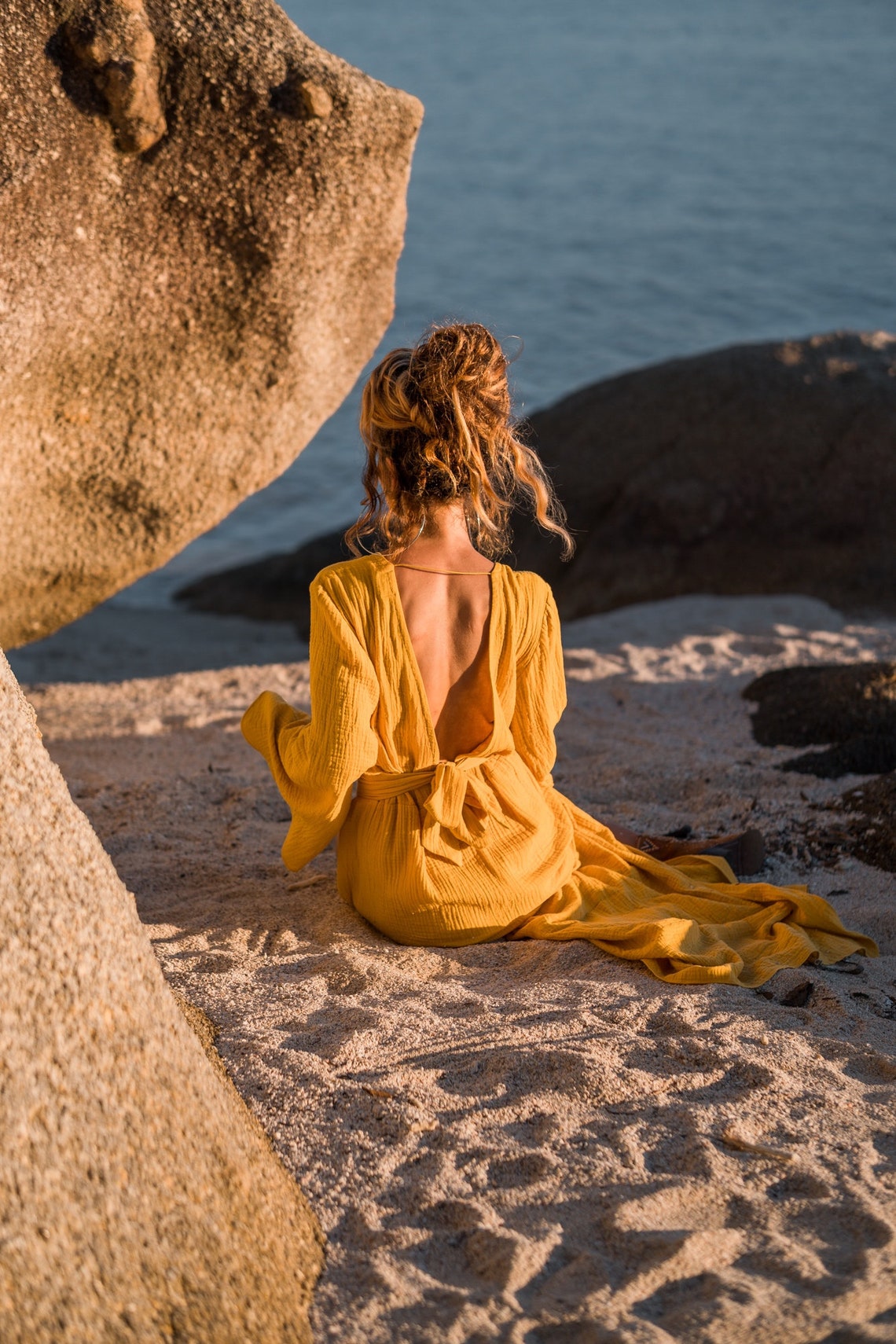 Floor-length boho dress with front slits. The large V-neck at the open back makes this dress sophisticated and delicate. The sewn-in wide belt can be adjusted and tied at the waist (free size), use a bow or just a knot at the waist line.