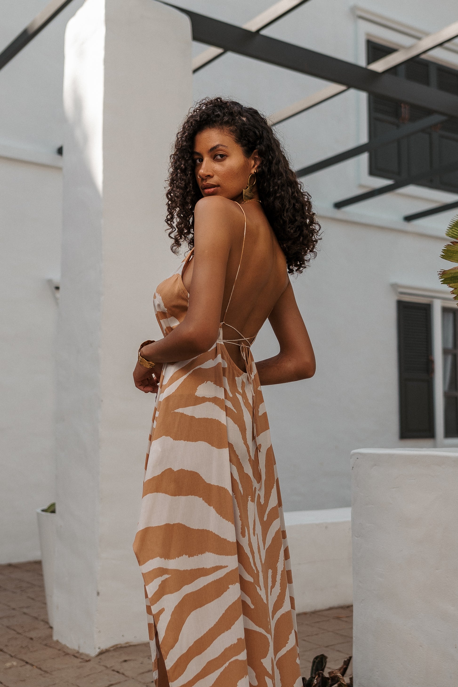 Crafted from 100% sustainable viscose fabric, this dress combines style and eco-consciousness. Its natural flowing fabric drapes beautifully, ensuring a perfect fit for any body shape. The thin straps and open back add a touch of femininity, enhancing its overall appeal.
